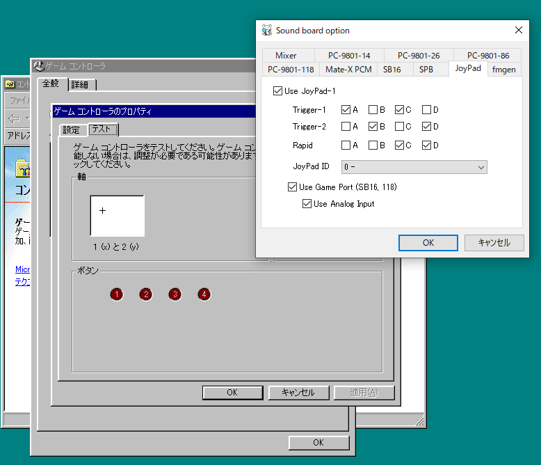 Sound Blaster 16等に搭載のゲームポートを使用できます。 アナログ入力も可能です。 ただしHAXM版では挙動が不安定です。